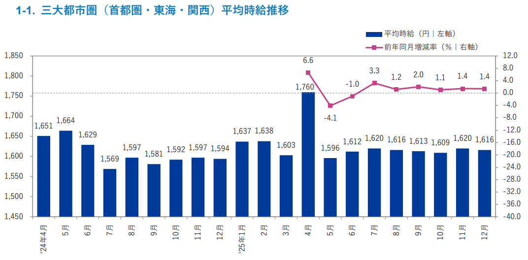 〇三大都市圏の平均時給は1,616円(前年同月1,594円、前月1,620円)