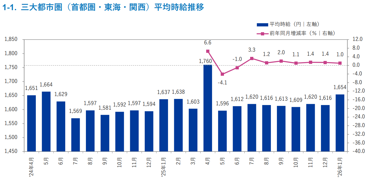 〇三大都市圏の平均時給は1,654円(前年同月1,637円、前月1,616円)